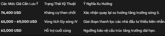 Mốc 74,400 USD không đơn thuần là một con số, đó là vùng xác nhận cho đà tăng trưởng mạnh mẽ của giai đoạn trước đó. Việc giá xuyên thủng ngưỡng này cho thấy sóng IV điều chỉnh đang diễn ra phức tạp hơn dự kiến. Trong lý thuyết sóng Elliott, sóng IV thường là giai đoạn gây ra sự khó chịu nhất, khiến nhiều anh em phải trăn trở vì những đợt dao động lên xuống không rõ xu hướng.