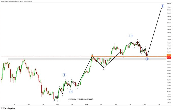 Salut fraților, eu sunt Anh Ba Công (COLE). Piața din ultimele zile într-adevăr pune la încercare răbdarea oricărui investitor. După ce prețul Bitcoin a pierdut oficial nivelul de suport important de 74,400 USD, o bătălie psihologică între taurii și urșii de pe piață a izbucnit mai puternic ca niciodată. Pentru a avea o perspectivă obiectivă și profesională, haideți să analizăm pe baza teoriei valurilor Elliott – cadrul care ne ajută să ne poziționăm în acest ciclu pe termen lung.