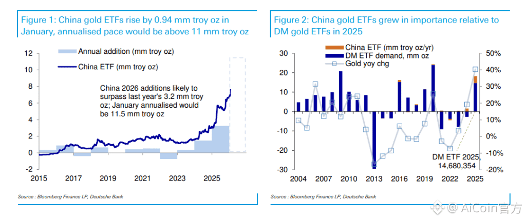 ○ 德意志银行报告揭示了一个关键数据:仅2026年1月,中国黄金ETF的增持量就高达约94万盎司。若按此速度年化,全年增持量可能达到惊人的1150万盎司。