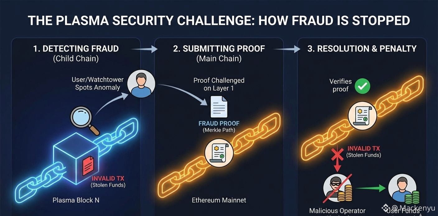 The Smart Safeguards: Proofs and Challenges: Plasma uses something called Merkle trees to summarize transactions into neat proofs. Periodically, the child chain sends a "snapshot" to the main chain. If there's any funny business, like a sneaky transaction, anyone can submit a "fraud proof" to challenge it. The main chain checks it out quickly, punishing the culprit. It's like having a neighborhood watch that only intervenes when needed—no constant policing, just smart oversight.