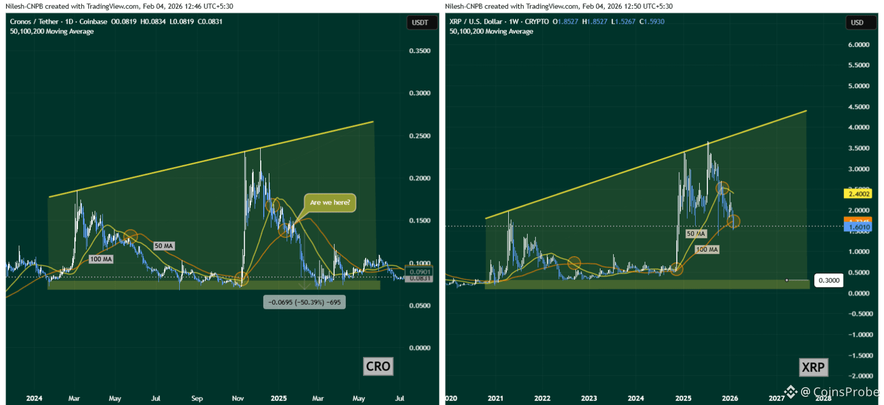 After peaking near upper resistance around $3.65 in mid-2025, XRP rolled over and entered a steep correction. Price first lost its 50-week moving average, and this week confirmed a breakdown below the 100 MA — closely mirroring CRO’s mid-correction phase that later triggered its larger drop.