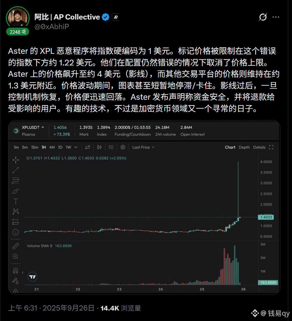 那天 Plasma 的原生代币 $XPL 正在多个市场交易,当晚约 UTC 23:00 左右,在去中心化衍生品交易所 Aster DEX 上,XPL 永续合约价格突然从 1.30 美元暴涨到了近 4 美元。