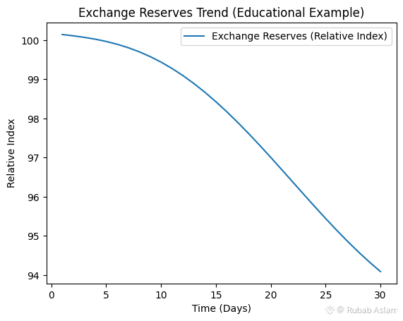 This chart shows a conceptual trend of exchange reserves over time, helping explain how on-chain data reflects market behavior rather than price direction.
