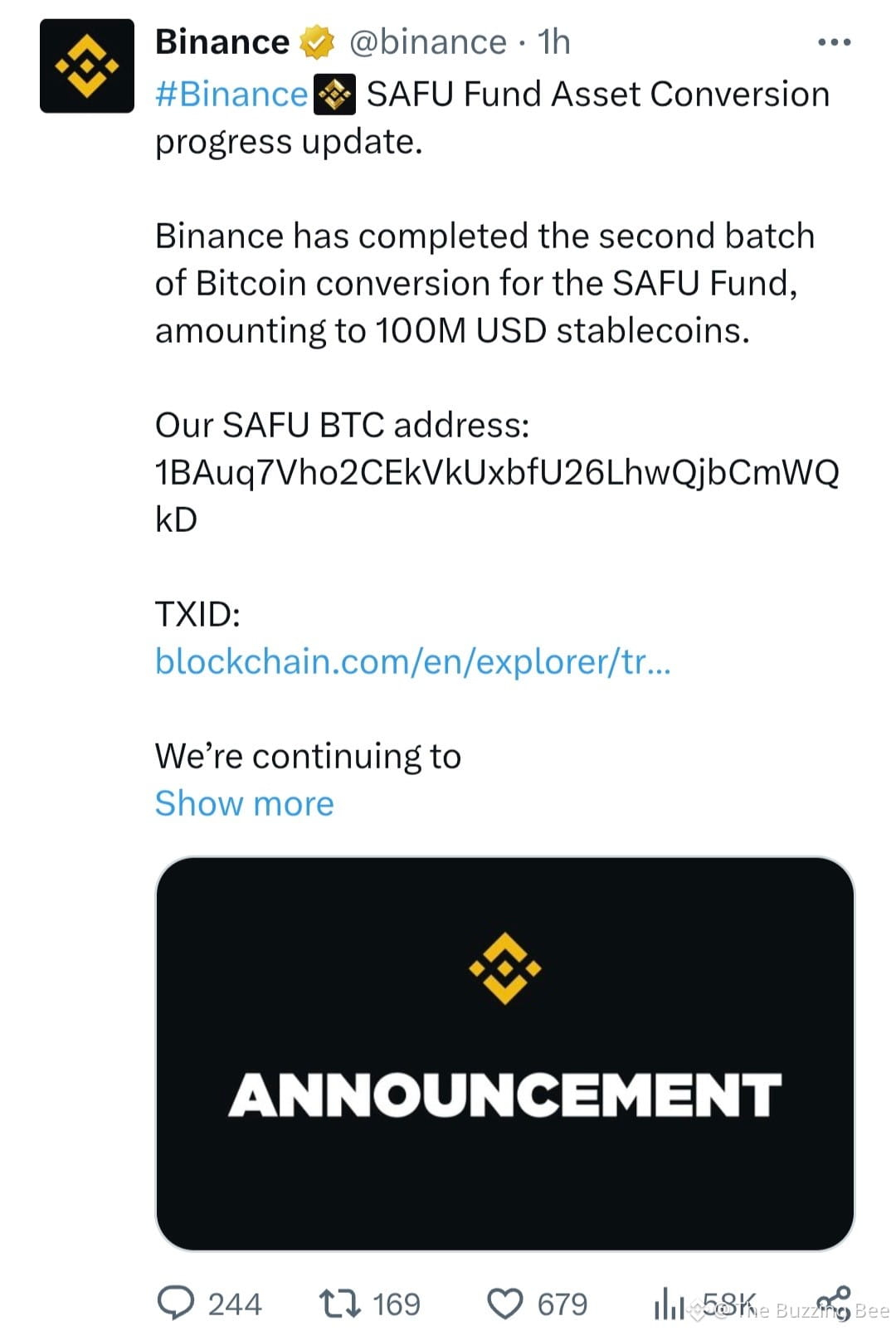 Binance later confirmed the transaction, stating that $100 million in stablecoins had been converted and that further BTC acquisitions would follow until the full $1 billion target is reached.