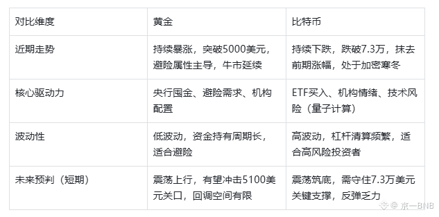 当下全球金融市场,分化已成常态——黄金凭借避险属性开启史诗级牛市,突破5000美元大关,成为央行、机构的核心配置资产;比特币则受量子计算威胁、机构撤离、市场情绪低迷等多重因素影响,跌破7.3万,抹去前期全部涨幅,16万人爆仓离场,加密寒冬仍在持续。
