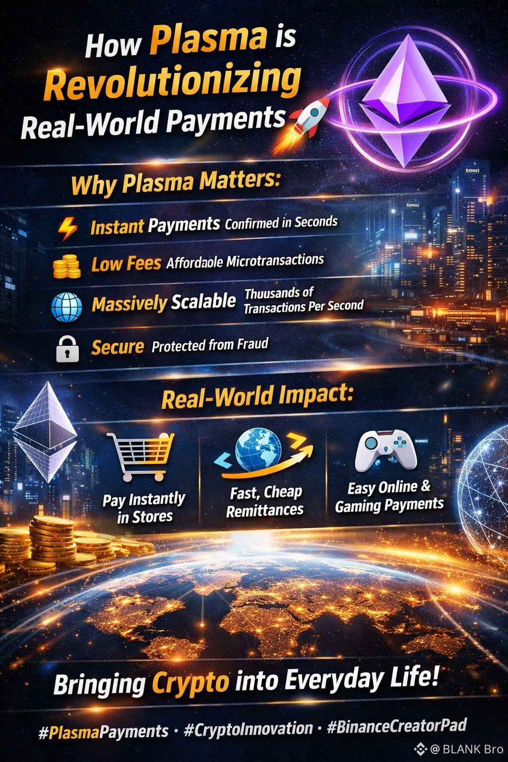 Crypto payments are evolving—and slow, expensive transactions are no longer acceptable. #Plasma , Ethereum’s Layer-2 solution, is here to change the game. It’s making crypto fast, affordable, and secure, so real-world payments finally feel practical. 💡 Why @Plasma Plasma Matters: Instant Payments: Transactions confirm in seconds, not minutes. Low Fees: Tiny payments, retail purchases, and subscriptions are now cost-effective. Massively Scalable: Handles thousands of transactions per second. Secure: Users can challenge fraud, keeping funds safe. Real-World Impact: Pay at stores instantly with crypto Send money internationally fast and cheap Seamless online subscriptions and gaming microtransactions @Plasma isn’t just tech—it’s a movement toward mainstream crypto adoption. It bridges #blockchain security and real-world usability, letting crypto move from theory to everyday practice. As a creator and blockchain leader, I’m committed to showing the world Plasma’s power, making payments faster, cheaper, and accessible for everyone.