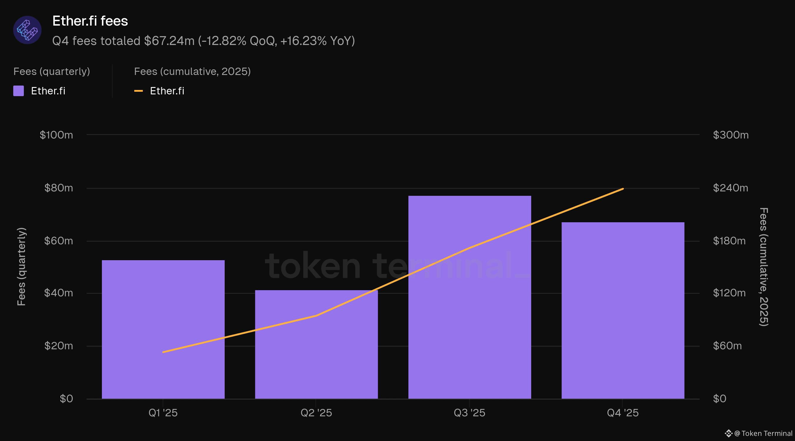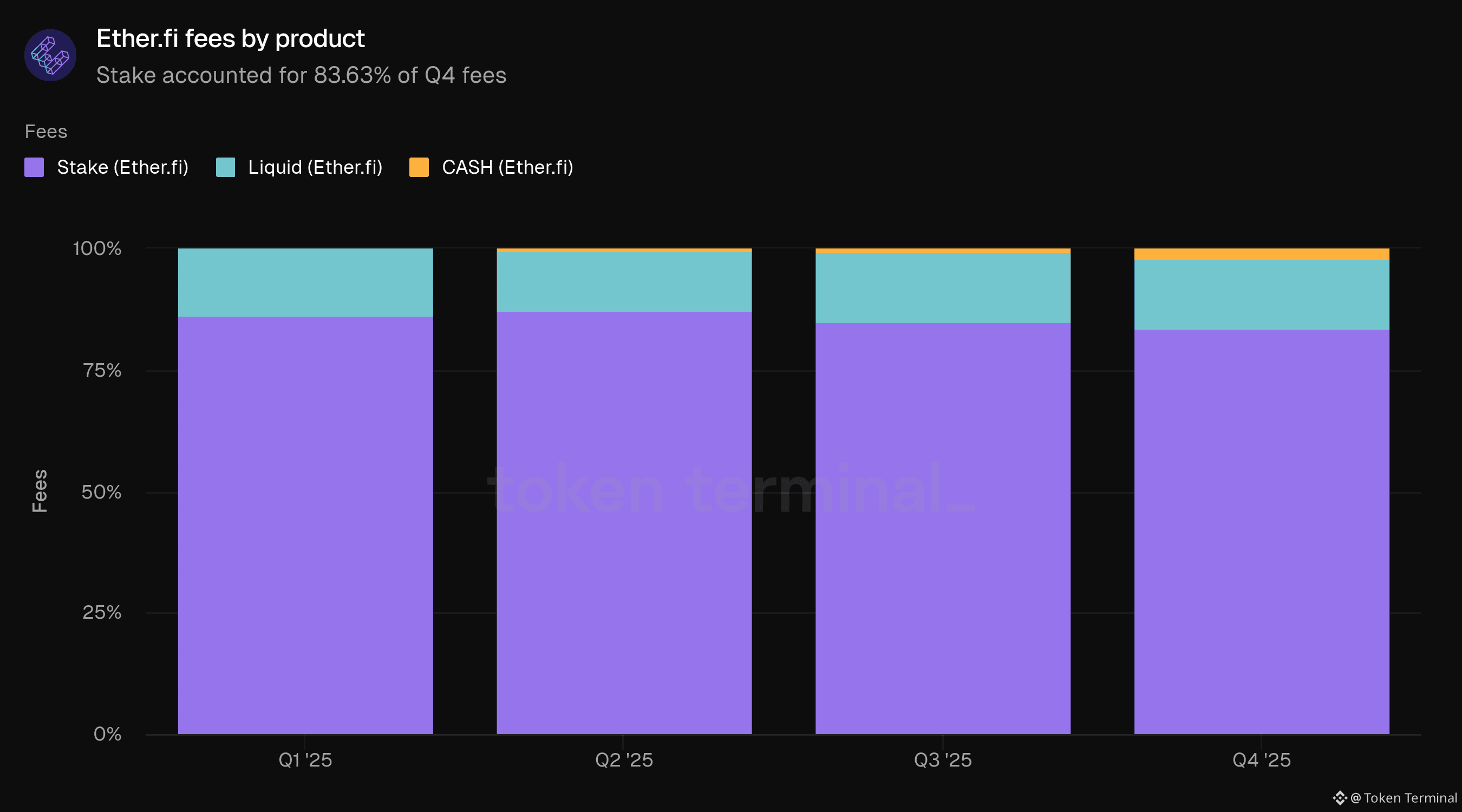 Fees measure the total USD value of fees generated across Ether.fi's product lines, including staking rewards from Stake, vault yield from Liquid, and fees from Ether.fi Cash. Q4 fees totaled $67.24m, down 12.82% from Q3's $77.13m but up 16.23% from Q4 2024's $57.85m. Cumulative fees for 2025 reached $238.77m by the end of Q4. Stake generated the majority of fees at $56.23m (83.63%), followed by Liquid at $9.74m (14.49%) and Ether.fi Cash at $1.26m (1.88%). Ether.fi Cash nearly tripled its fee share from 0.63% in Q3 to 1.88% in Q4, while Stake and Liquid remained relatively stable.