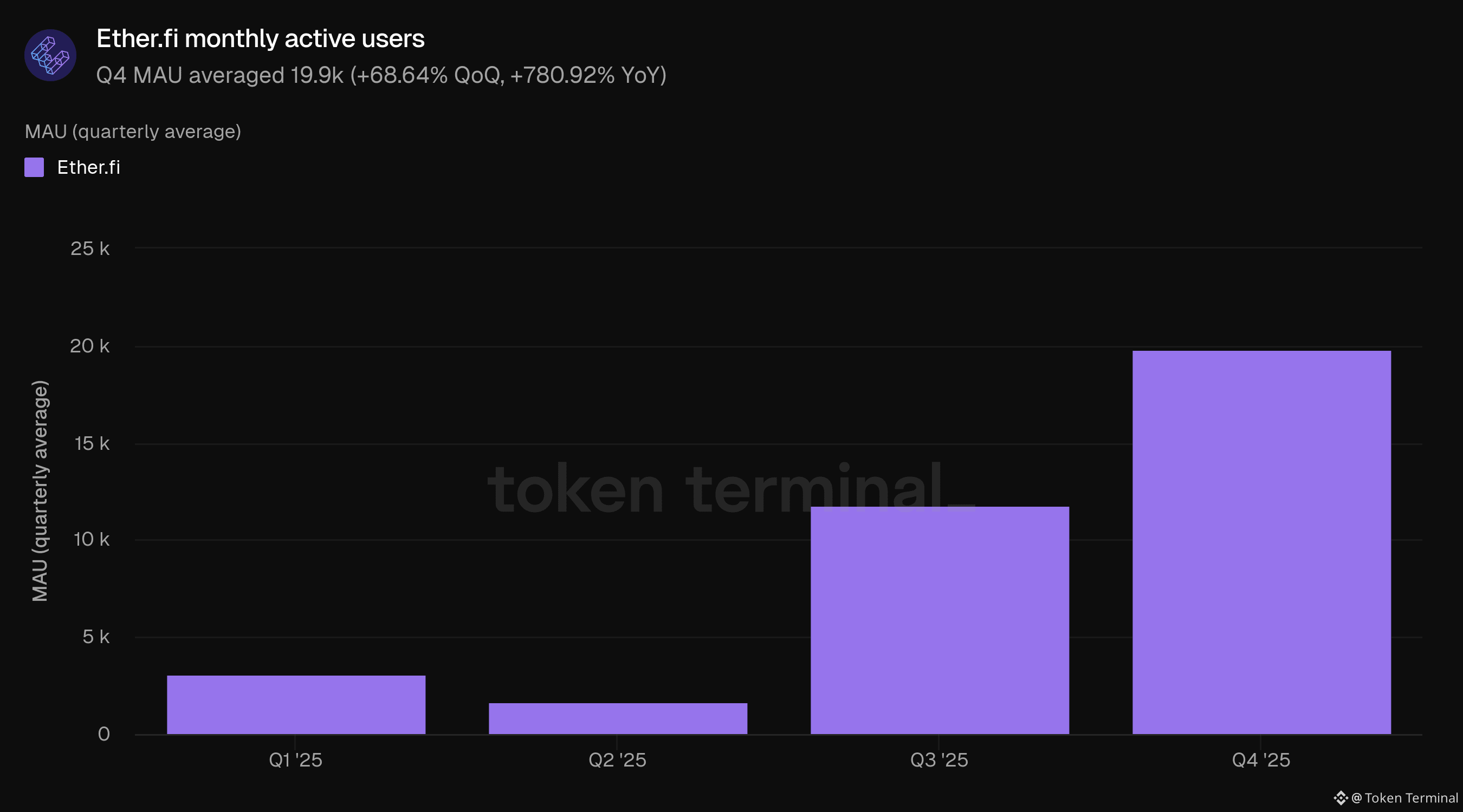 Monthly active users (MAU) measures the number of unique wallet addresses that interacted with any Ether.fi product within a 30-day rolling window. Q4 MAU averaged 19.9k, up 68.64% from Q3's 11.8k and up 780.92% from Q4 2024's 2.26k. Ether.fi Cash drove the vast majority of user activity at 18.51k (93.02%), followed by Stake at 818 (4.11%) and Liquid at 571 (2.87%). Ether.fi Cash's share of MAU grew from 80.55% in Q3 to 93.02% in Q4, while Liquid's share declined from 10.63% to 2.87%.