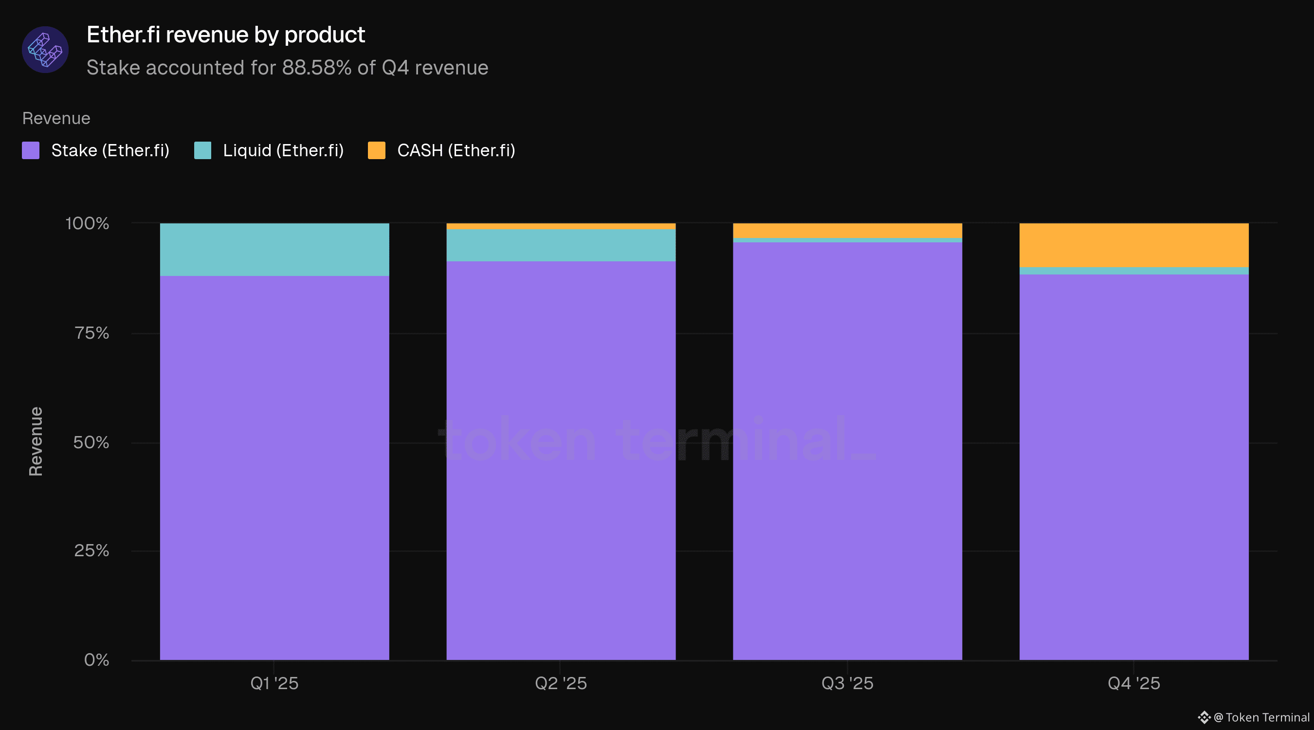 The product mix shifted notably toward Ether.fi Cash. Cash's share of MAU grew from 81% to 93%, while its revenue contribution more than tripled. Despite this user growth, Stake continues to dominate the project's economics, accounting for the vast majority of both TVL and revenue. Liquid's share contracted across most metrics.