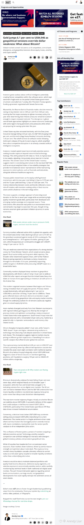 The post Gold jumps 6.1 per cent to US$4,946 as geopolitical tensions override dollar weakness: What about Bitcoin? appeared first on Anndy Lian by Anndy Lian.