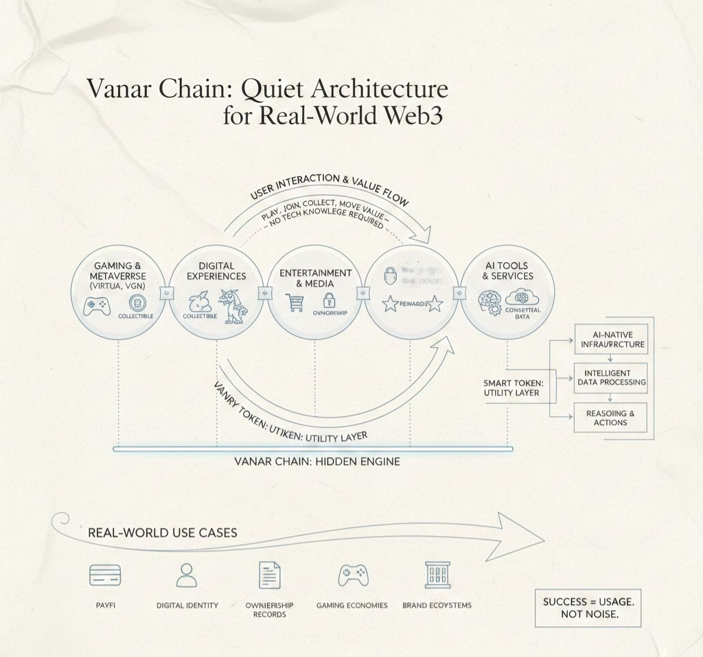 Instead of designing for crypto-native users and hoping the mainstream eventually follows, Vanar’s direction suggests the opposite path: start where everyday users already are—gaming, digital experiences, brands, entertainment, AI tools—and quietly place blockchain underneath those environments as a silent engine.