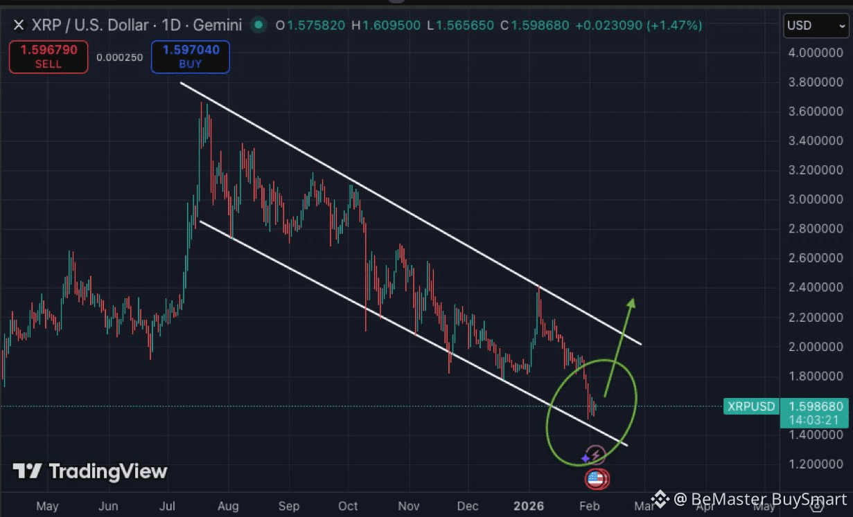 👉 XRP has bounced from the lower edge of its descending channel after dipping toward the $1.40–$1.50 zone, according to daily chart data. The token is now pushing back toward the channel's midpoint, but the broader downtrend structure is still in place. A clean escape from this bear channel is necessary to properly signal a return to bullish conditions.