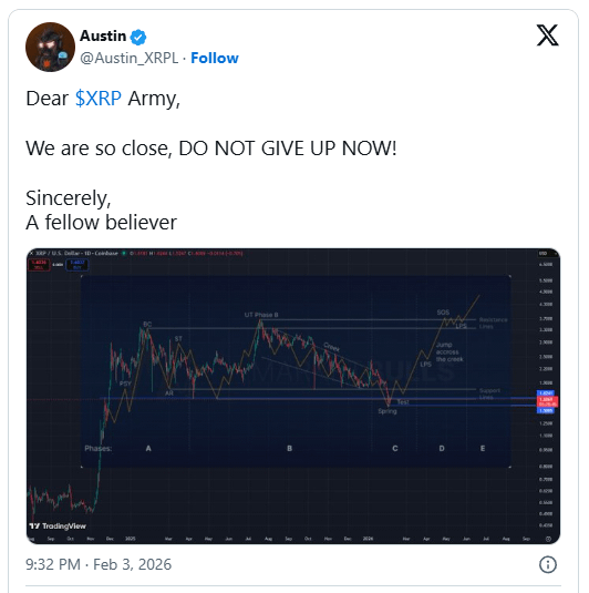 Această perspectivă a fost recent întărită de Austin, un analist crypto pe X, care a îndemnat comunitatea XRP să nu renunțe în această etapă critică. Referindu-se la un grafic detaliat TradingView, Austin a subliniat structuri tehnice care sugerează că XRP se apropie de sfârșitul unei corecții prelungite, mai degrabă decât de începutul unei noi tendințe descendente. Mesajul său a rezonat cu traderii care recunosc cum piețele adesea se comportă înainte de tranziții majore.