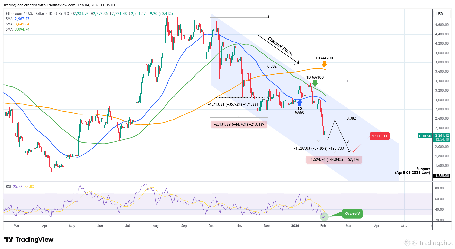 The 1D RSI turned oversold (below 30.00) for the first time since November 21 2025 but besides a (potential) short-term dead-cat-bounce towards the 0.382 Fibonacci retracement like on November 10 2025, it should bottom lower, at least at $1900 making a -44.80% decline (at least), similar to the previous Bearish Leg, before any meaningful longer term relief rally.
