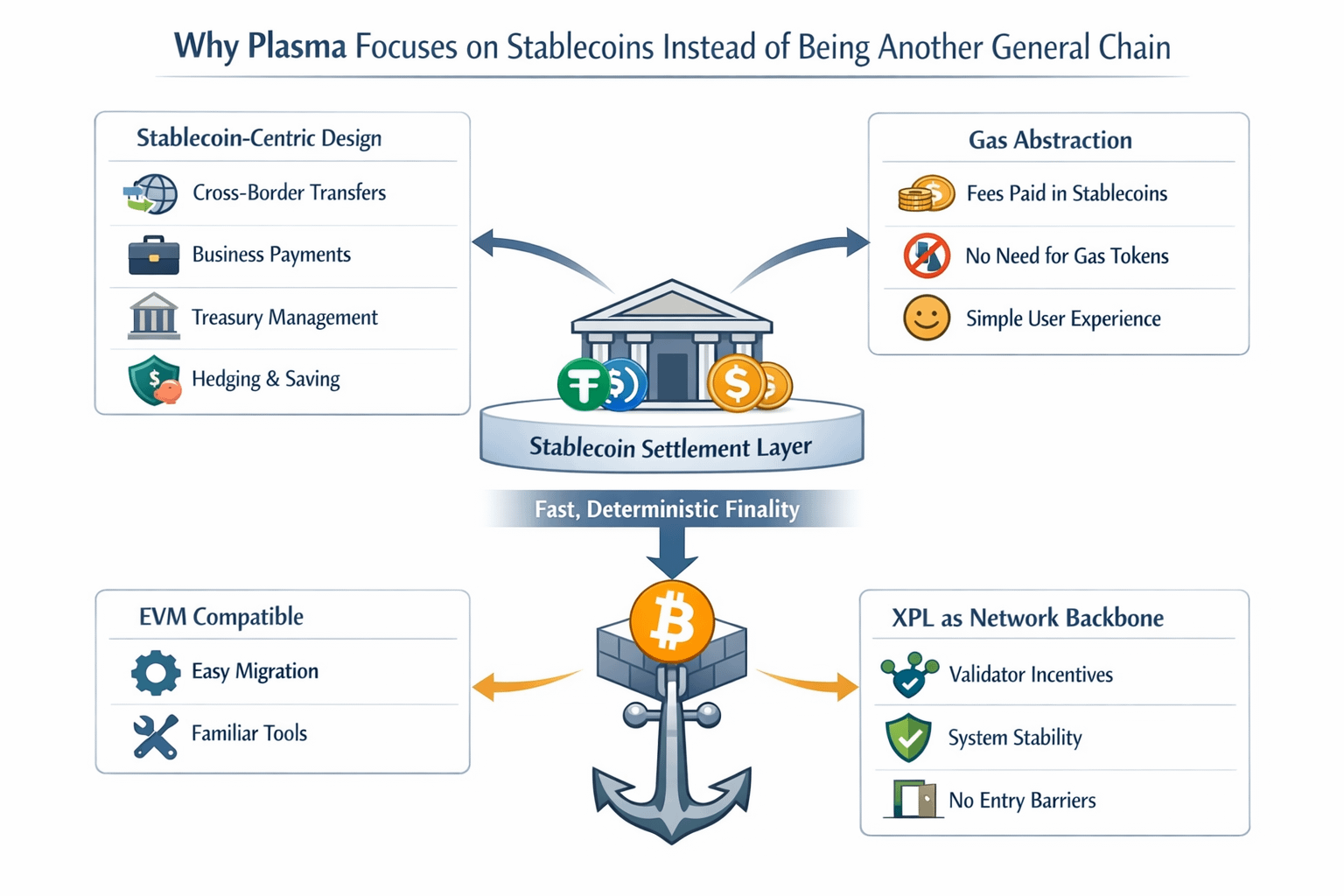 Plasma is not positioning itself as a chain for everything. It is positioning itself as settlement infrastructure, specifically built for stablecoin payments. That single design choice changes almost every decision the network makes.