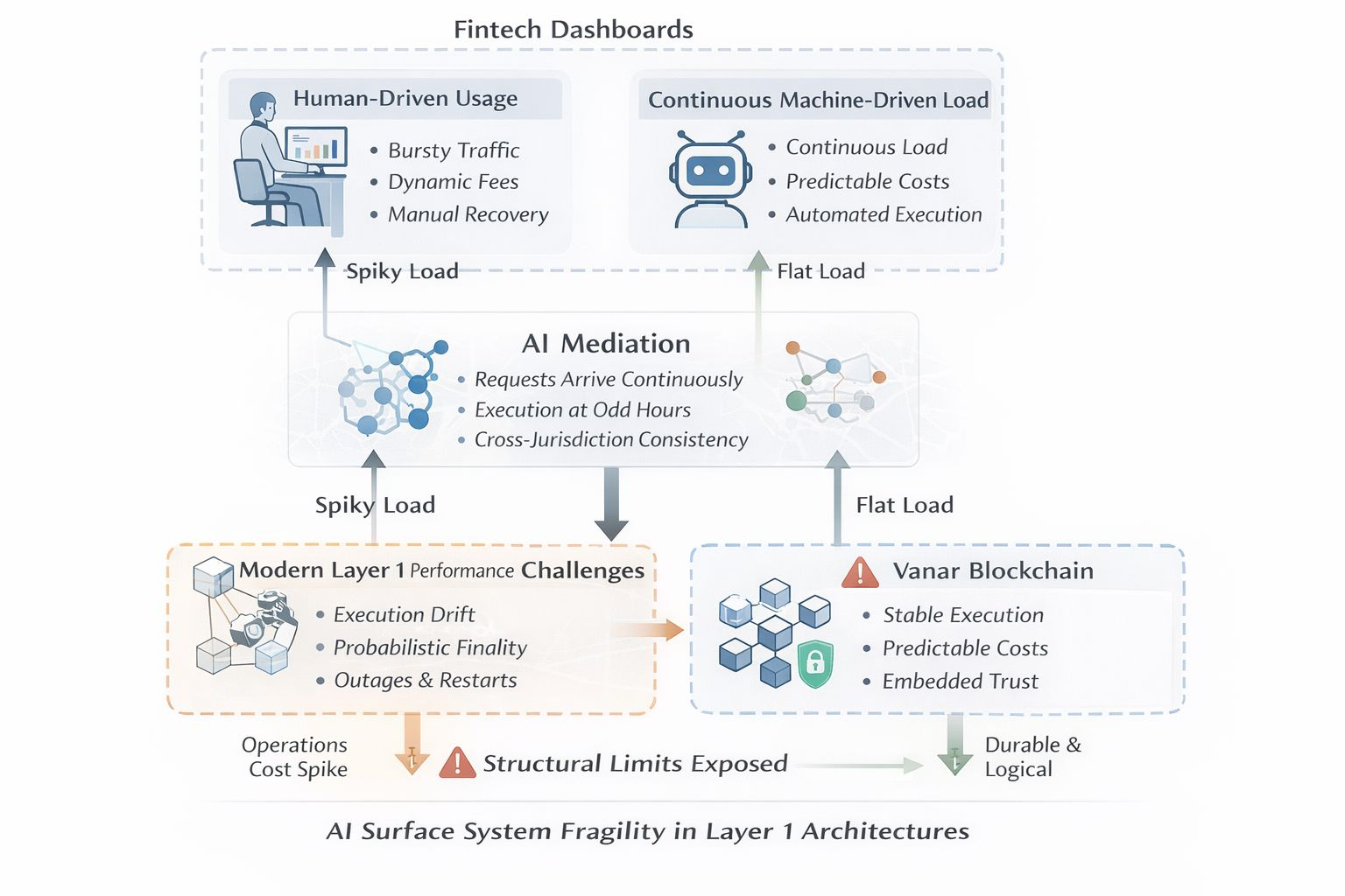 Picture a payments dashboard used by a mid sized fintech. Nothing exotic, settlements, reconciliation, compliance logs. One quiet weeknight, an AI agent is switched on to automate dispute resolution. It doesn’t spike usage,it smooths it. Traffic becomes continuous instead of bursty. Requests arrive at odd hours, across jurisdictions, with machine level consistency. Three weeks later, no incident report is filed. The dashboard is simply used less. A month after that, the AI feature is rolled back. Nothing visibly broke, but something felt exposed. That feeling systems working until they are depended on continuously is where the AI era begins to surface structural limits in modern Layer 1 blockchains.
