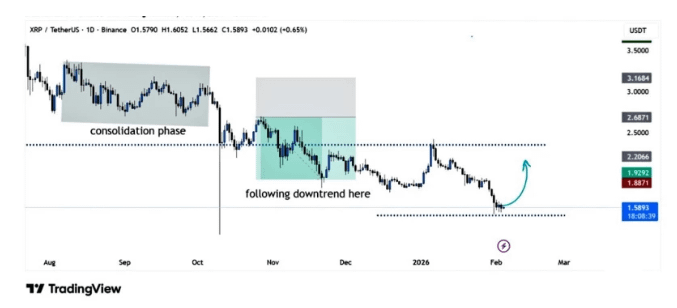 👉 Before the bounce, XRP had been in a clear downtrend through late 2025 into early 2026, making lower highs and lower lows. Selling pressure started fading as price neared the $1.55–$1.60 zone, where demand had previously absorbed the downside. The reaction here suggests sellers couldn't push lower this time around, leading to stabilization instead of continued decline.