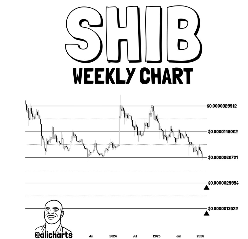 If SHIB stays above this level, it could stabilize and attempt a rebound toward higher resistance zones. However, a decisive weekly close below the support would weaken the structure and likely trigger further downside, bringing lower price targets into focus.
