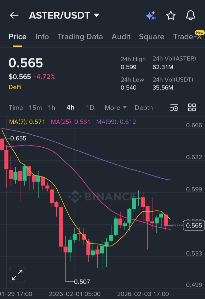 ASTER is trading around $0.565 down significantly from recent highs but showing early signs of base formation. The price has respected the $0.50–$0.53 demand zone, which aligns with a previous liquidity grab. Despite trading below the **MA(99)**, short-term momentum is stabilizing.