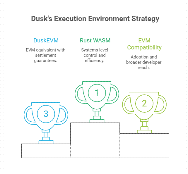 This tells you something important. Dusk is not betting everything on one programming world. It supports EVM for adoption and Rust WASM for systems level control.