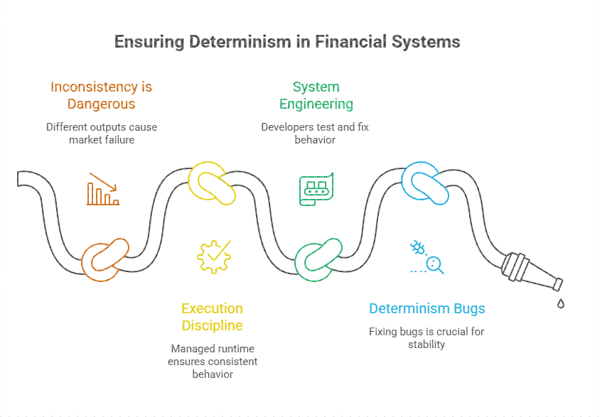 Non deterministic behavior is treated as a defect not an edge case. That mindset is rare in crypto and very common in finance.