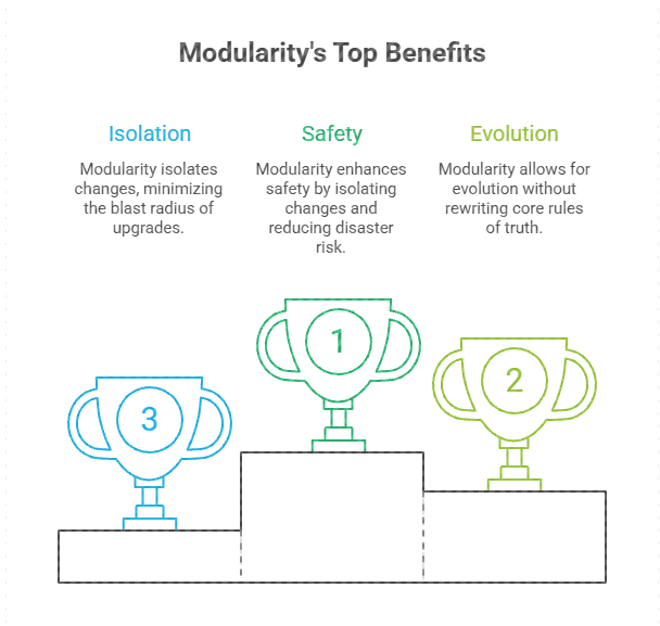 This allows evolution without rewriting rules of truth. Changes are isolated. Blast radius is smaller.