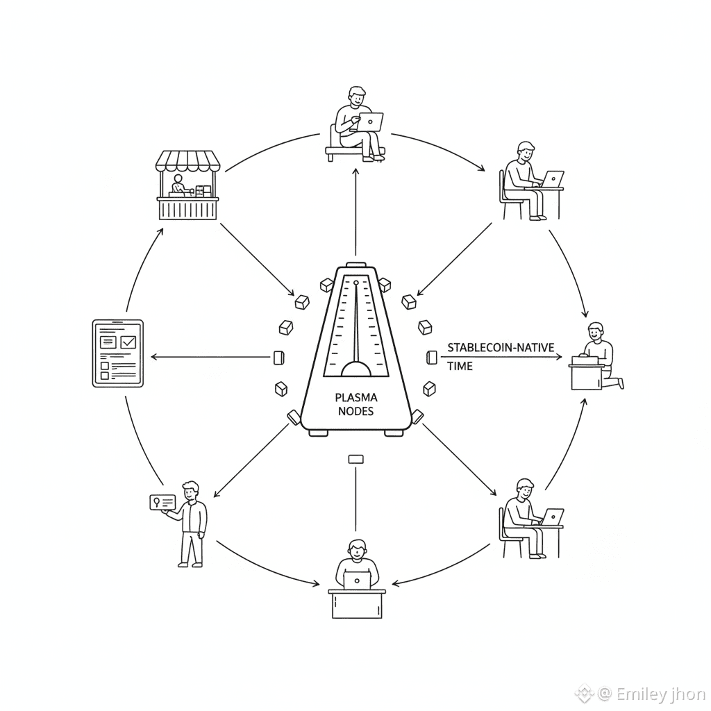 Blockchains usually measure time in blocks. Plasma measures time in stability. That distinction sounds subtle, but it changes how the system behaves under real economic pressure. When stablecoins anchor gas, transfers, and settlement, the chain’s tempo aligns with human expectations instead of market volatility.