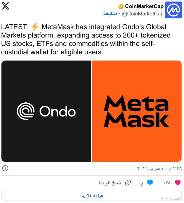 وسّعت MetaMask محفظتها ذات الحفظ الذاتي عبر دمج Ondo Global Markets. ونتيجة لذلك، يمكن للمستخدمين المؤهلين الآن تداول أكثر من 200 سهم أمريكي مرمّز وصناديق مؤشرات متداولة (ETFs) وسلع مباشرة داخل المحفظة باستخدام USDC. يساهم هذا الدمج في ردم الفجوة بين التمويل التقليدي والتمويل اللامركزي (DeFi).