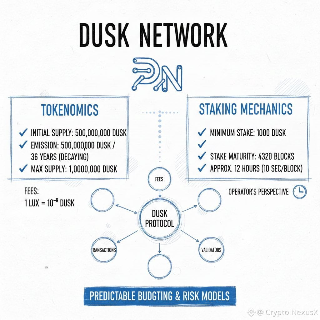 What also stands out is how Dusk treats the token and staking mechanics like operational infrastructure, not just a community feature. Their tokenomics documentation is unusually direct: an initial supply of 500 million DUSK, another 500 million emitted over 36 years with a decaying schedule, and a max supply of 1 billion. Fees use LUX as a subunit, where 1 LUX equals 10 to the minus 9 DUSK. These are the kinds of details institutions actually care about because they translate into predictable budgeting and risk models.