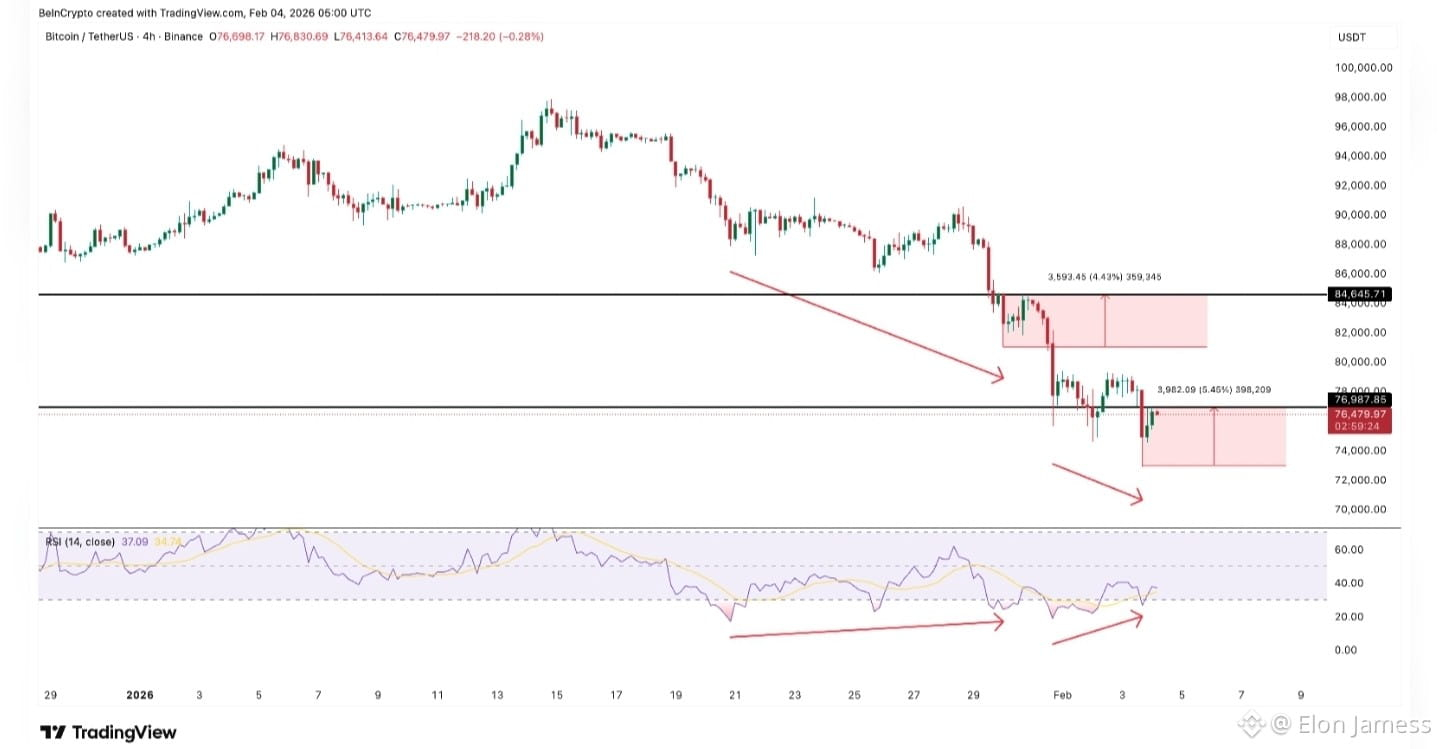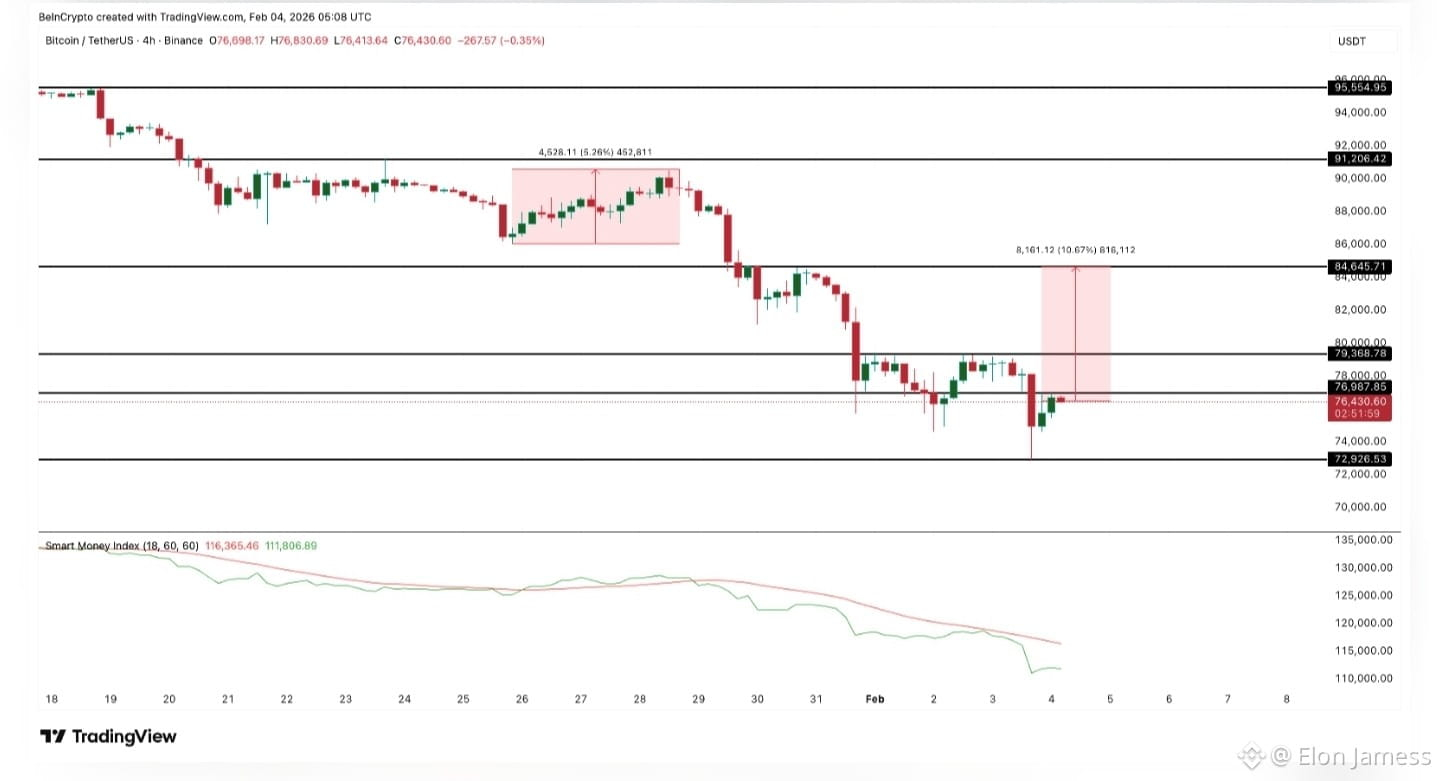 The Bitcoin price saw a short-term rebound after slipping to recent lows, gaining nearly 5% from its late-January bottom to test the $76,980 zone. This $BTC price move followed a bullish momentum setup on the 4-hour chart, where selling pressure appeared to weaken.