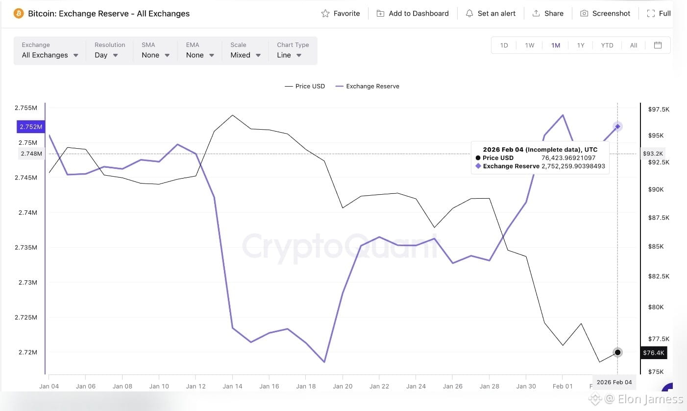 Bitcoin exchange reserves hit a recent low of 2.718 million $BTC on January 19. Since then, reserves have climbed to about 2.752 million $BTC.