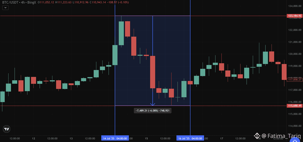 BTC/USDT, July 14–16, 2025: Whale-triggered sell-off caused a 6% drop