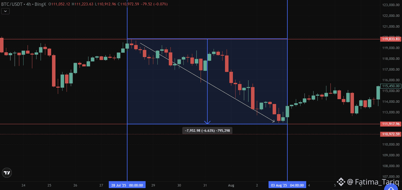 BTC/USDT, July 28–Aug 03, 2025: Whale-triggered sell-off caused a 6% drop