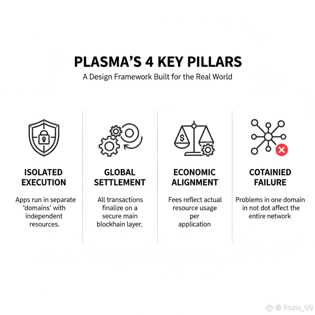 Plasma offers a different approach.Instead of cramming all activity onto one execution layer,it carves out separate spaces“domains” where apps can do their thing independently. Each domain handles its own transactions, sets its own rules,and decides how to price its resources.But when it’s time to settle up, resolve disputes,or lock in finality,everything goes back to the main blockchain.Trust stays rock solid because the base layer still handles the most important stuff.