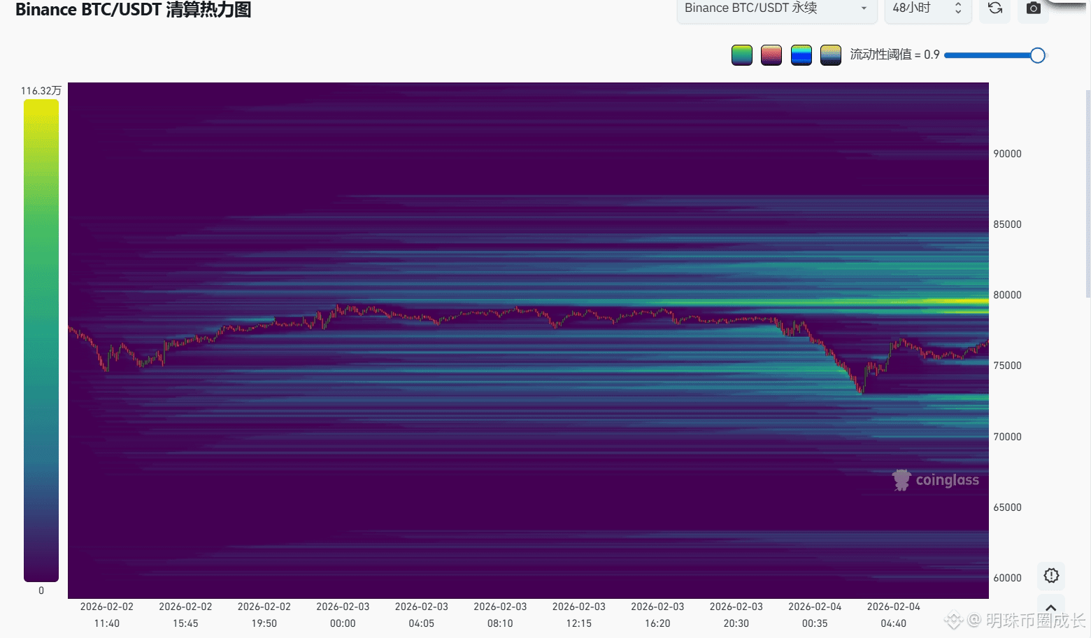 昨晚下探至72,889美元后迅速拉回,已经是一次标准的“插针扫损”,清掉了74K下方的薄弱多头止损单。