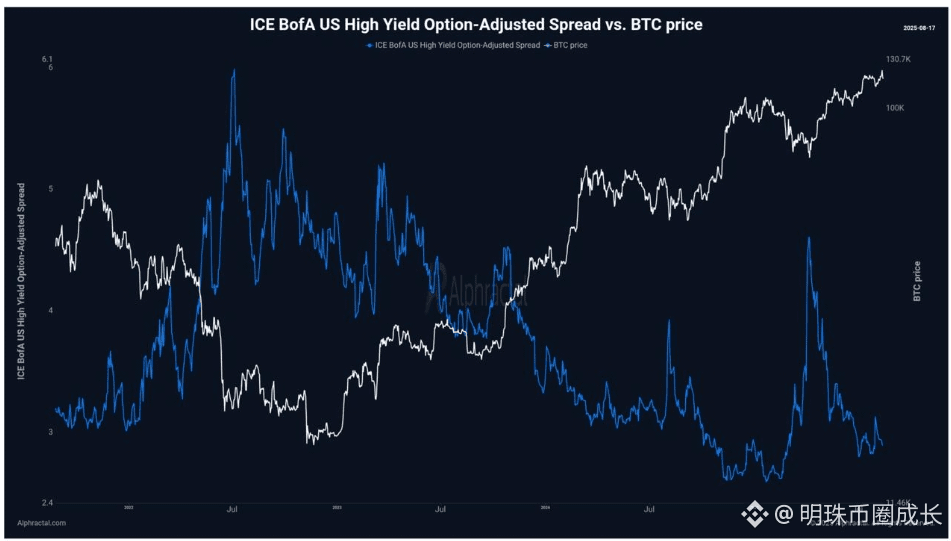 ICE BofA美国企业指数期权调整利差 链上层面:巨鲸在向交易所存款,没错。但请仔细看:已实现盈亏比(SOPR)已快速跌至1附近。这意味着,整体上卖出比特币的人,基本已经无利可图。大规模的、恐慌性的获利抛压正在迅速衰竭。这不是牛市顶部的特征,更像是中期调整中“杀估值、杀杠杆”的阶段。