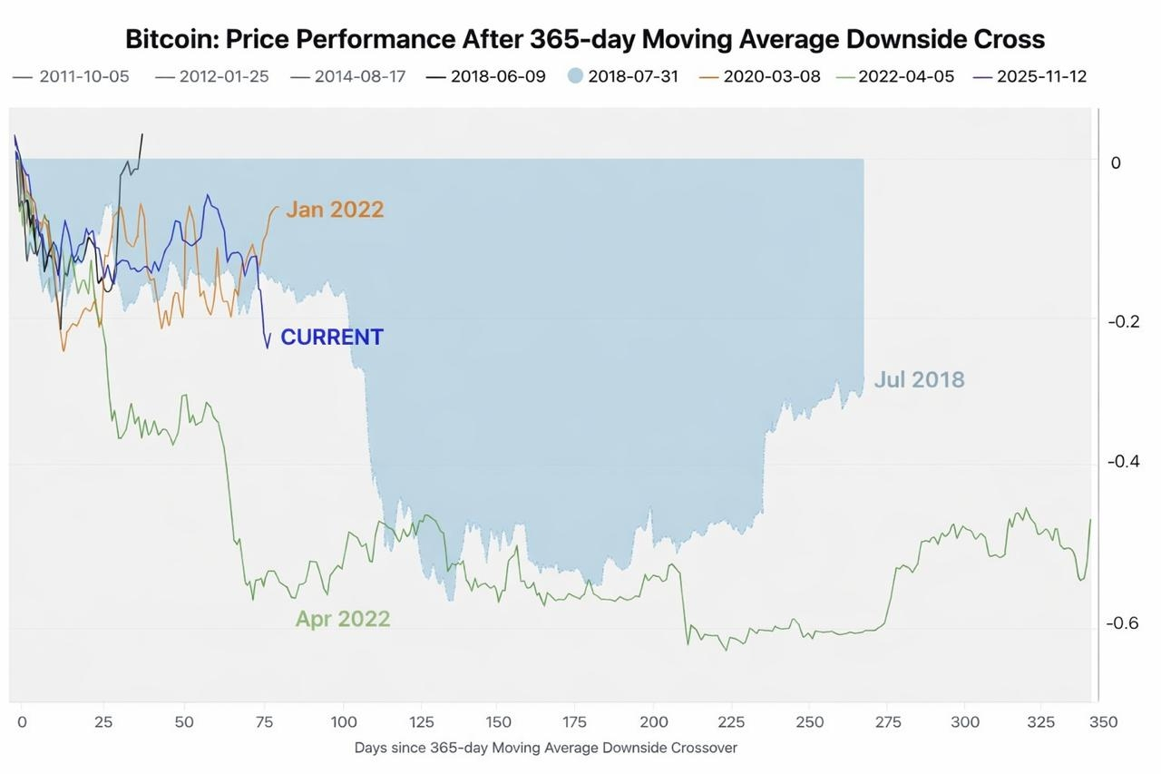 Acest număr contrastează puternic cu începutul anului 2022, când Bitcoin s-a corectat doar cu aproximativ 6% în aceeași perioadă de timp după ce a pierdut MA 365.