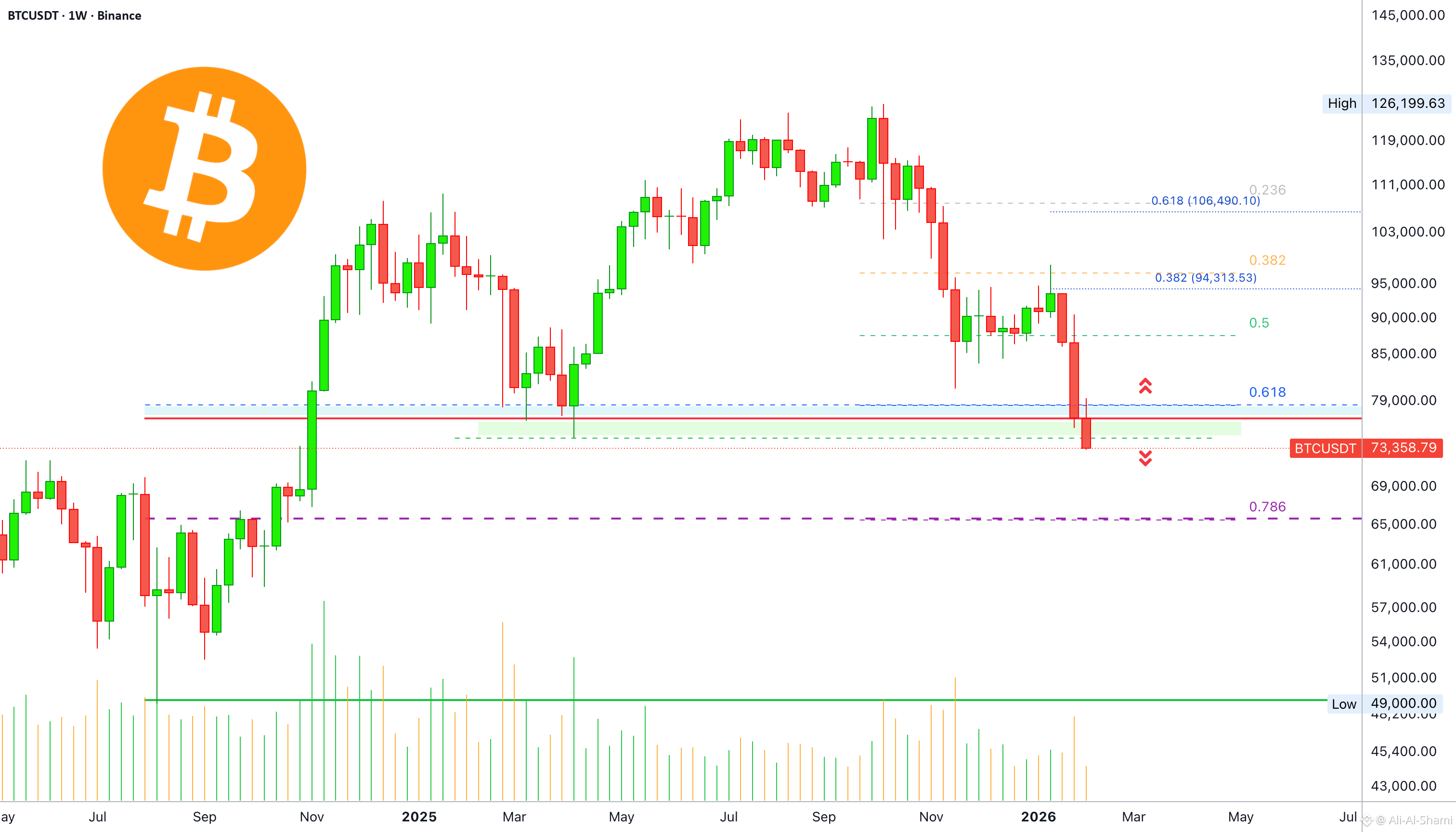 الهدف التالي هو 65,000 دولار والذي يتوافق مع مستوى تصحيح فيبوناتشي 0.786 على الرسم البياني الحالي. تحت هذا المستوى، لدينا دعم إضافي على المدى المتوسط، 55,555 دولار و 50,000 دولار.