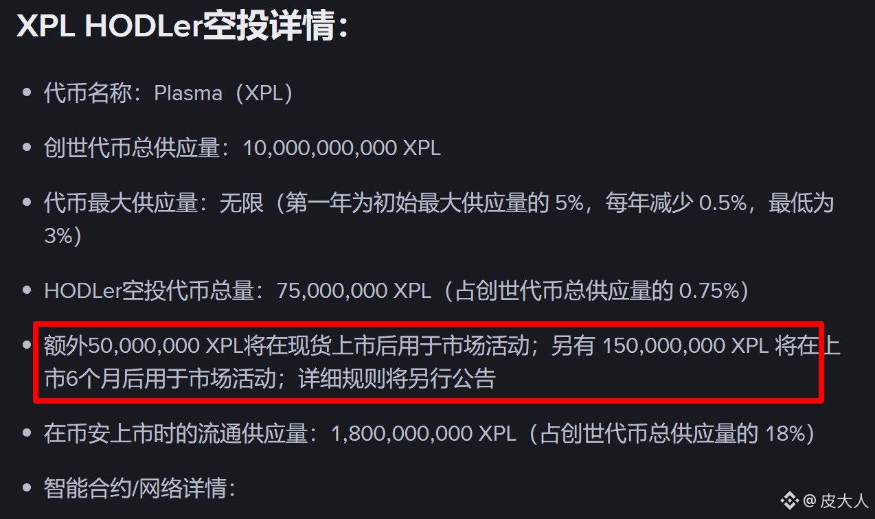 XPL于2025年9元25日上线币安,至26年3月25日满6个月,也就是说,按照公告,从下个月起,将有1.5亿的XPL开始用于市场活动,目前价值1500万美元。
