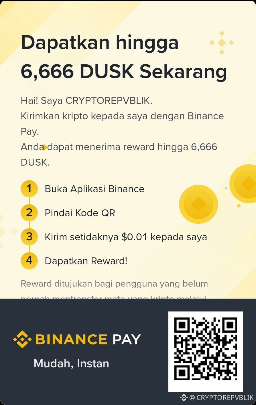 Gaesss .. Buat semua pengguna Binance, khususnya yang belum mencoba fitur Binance Pay jangan lewatkan kesempatan dapat reward token $DUSK dari @CRYPTOREPVBLIK Caranya sangat mudah dan instan.