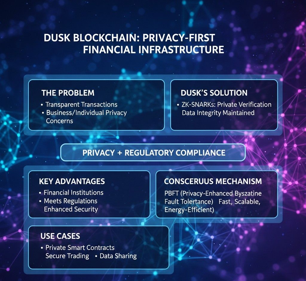 Dusk Blockchain is designed to solve one of the most pressing issues in digital finance today: privacy. As the blockchain space grows, so does the need for secure, private financial transactions. Traditional blockchain systems often expose transaction details, which creates a problem for businesses and individuals concerned about privacy. @Dusk addresses this by using advanced cryptographic techniques like zk-SNARKs, allowing transactions to be verified without revealing sensitive data. This ensures privacy while keeping the blockchain’s integrity intact.