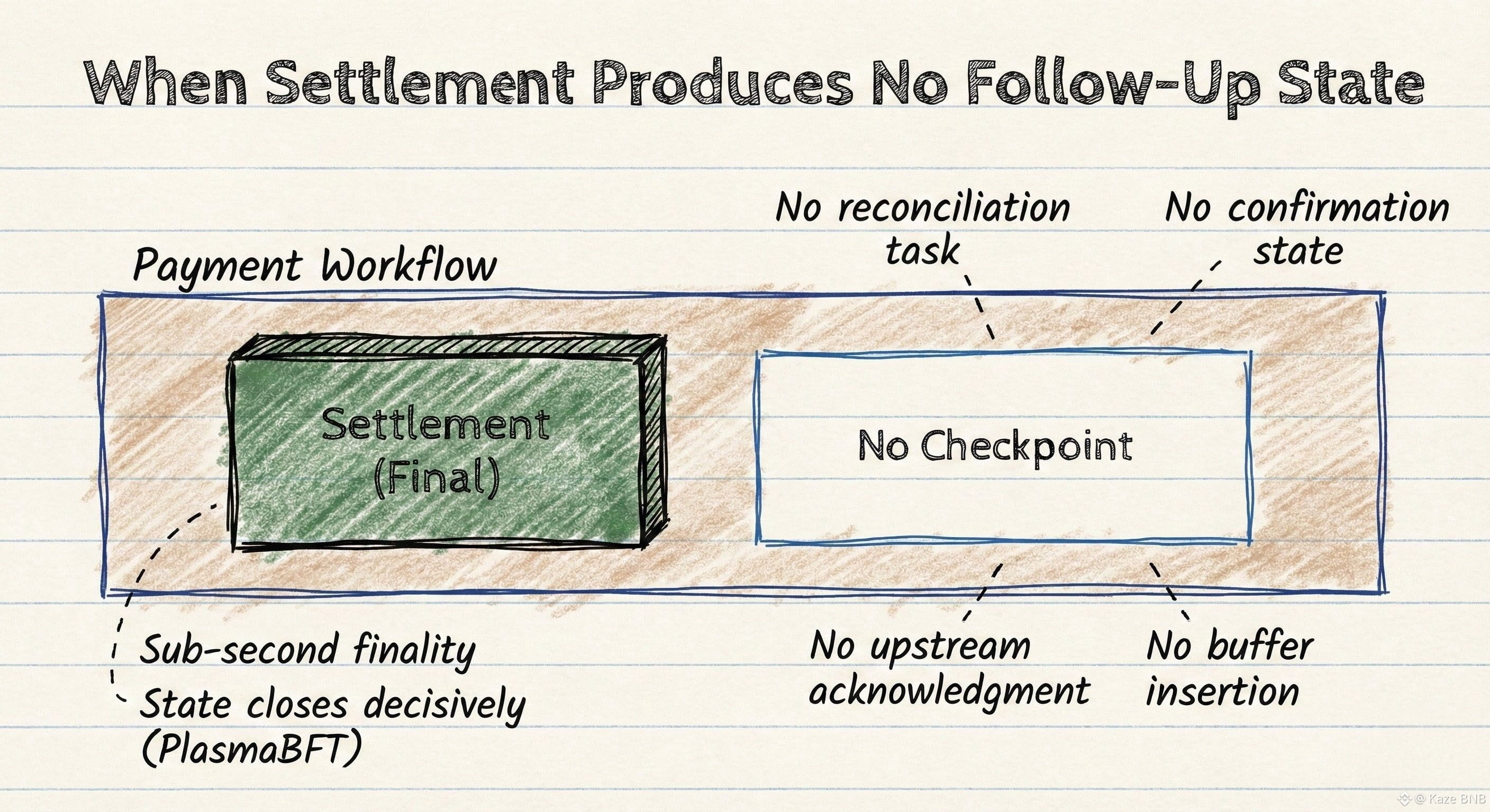 With PlasmaBFT and sub-second finality, settlement doesn’t stretch into a window. It snaps shut. There’s no long tail where someone can justify waiting “just in case.” The chain stops offering excuses for delay, and that forces the rest of the workflow to confront its own assumptions. If the process still won’t move, it isn’t because the payment is unclear. It’s because the surrounding workflow was built to lean on ambiguity.