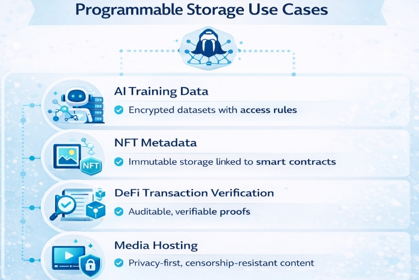 What makes Walrus truly compelling is that it’s programmable. Unlike traditional storage networks, which simply hold files, Walrus allows developers to build applications that interact with data as programmable assets. Imagine creating a decentralized application where users can store media, share datasets, or even train AI models without ever giving up ownership. The possibilities are vast. I found myself thinking of practical use cases almost immediately: decentralized AI training, NFT metadata storage, DeFi transaction verification, and even secure media hosting for content creators.