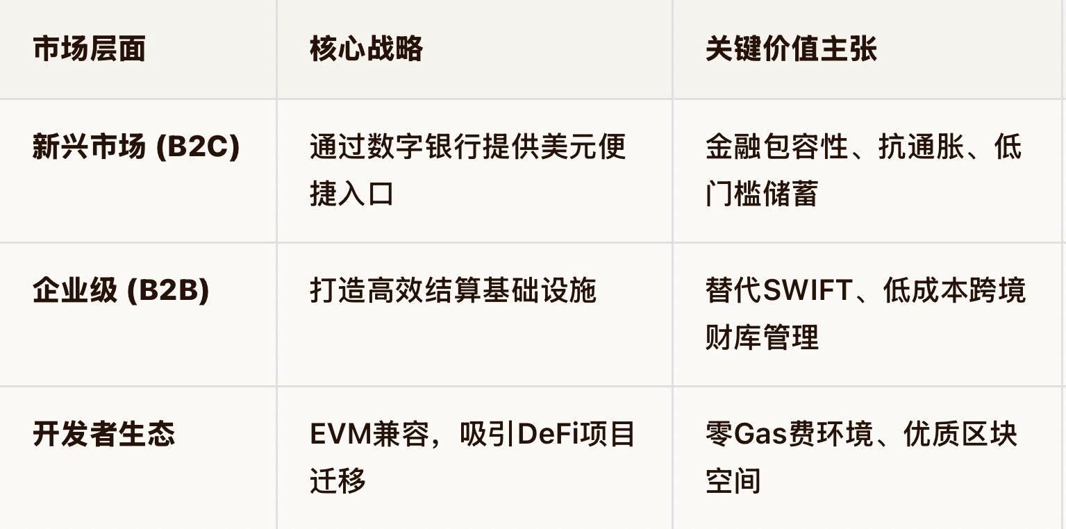 目前在世界的一些特殊地区,比如说跨境电商新发展的东南亚和通货膨胀极其严重的非洲地区,美元稳定币得需求十分旺盛,传统银行跨境费用高昂和本地法币迅速贬值的各种问题,Plasma精准的捕捉到这些切入点。通过和Tether的深度合作,使得Plasma可以毫无费力的人把usdt轻松在全场建立基点。并且凭借背后资本的强大实力,Plasma可以轻松的和大机构、大银行合作,化对抗为合作,成为银行等传统结算层的一环,合作共赢。同时Plasma通过Plasma one数字银行为用户提供了储蓄、消费、收益三位一体的美元消费体系,也是实现了生态闭环,先通过零手续费转账吸引用户,通过稳定币收益留住用户,在用消费返现引导用户在日常生活消费稳定币,这就是Plasma的层层递进。