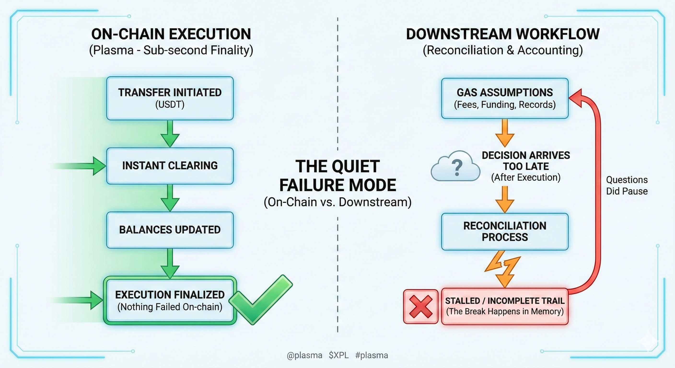 In most systems, even when stablecoins move fast, humans still do the slowing. Gas choices create hesitation. Confirmation windows turn into social buffers. Teams wait not because value hasn’t moved, but because responsibility hasn’t caught up yet.