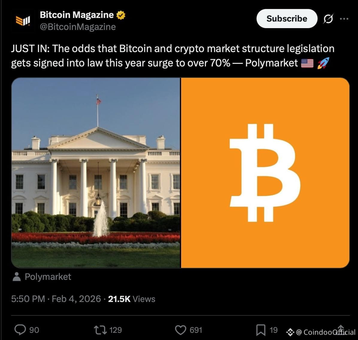 The sharp move in Polymarket odds underscores a growing belief that U.S. crypto market structure legislation is gaining real momentum. According to the prediction platform, the probability that Bitcoin and broader crypto market structure rules will be signed into law this year has surged above 70%, reflecting shifting expectations among traders and political observers alike.