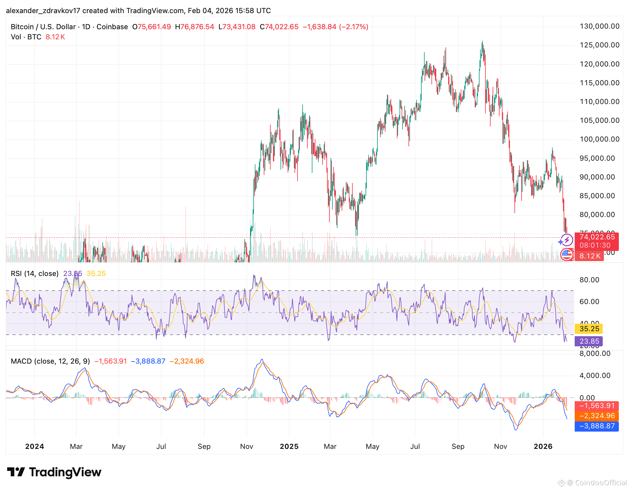 Bitcoin is currently trading around $74,000 after failing to hold higher levels earlier in the week. On a daily timeframe, the price is down roughly 5% over the past 24 hours and more than 17% over the past seven days, according to the market overview. The sell-off has pushed Bitcoin toward a critical support zone that previously acted as a consolidation area during prior pullbacks.