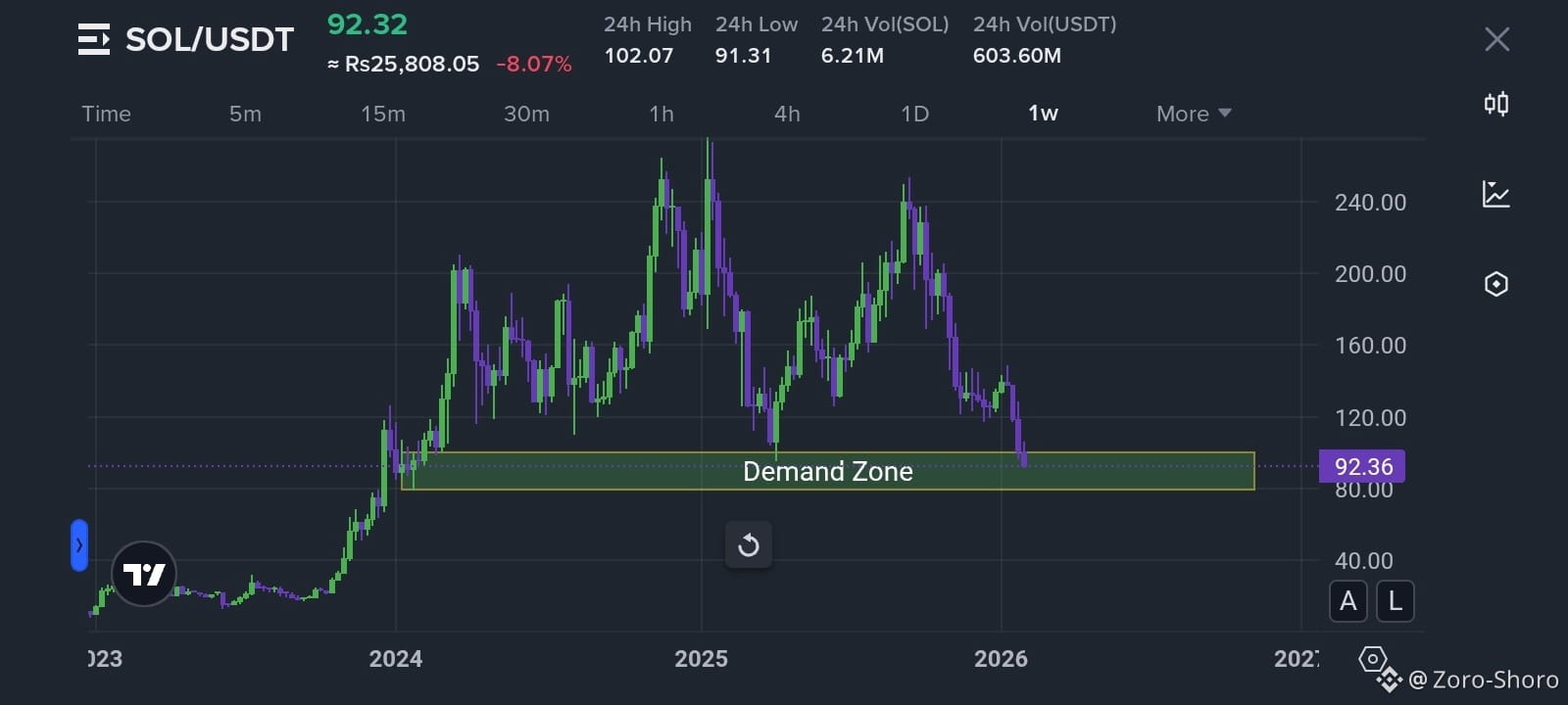 $SOL has just approached a key demand zone from which price previously exploded. However, this time a similar move may be less likely, as $SOL has now formed a lower high instead of a higher high, signaling potential weakness.