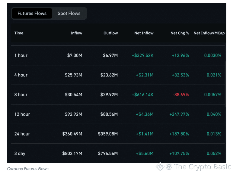 Over the past 24 hours, Cardano has experienced solid market participation, with a $360.49M net inflow in futures. This reflects a positive $1.41M in net change, which is an impressive 187.80% increase from previous figures.