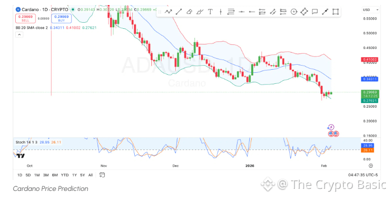#Cardano is currently trading near the $0.2991 level, with the immediate support zone located at $0.28, having bounced off the lower Bollinger Band. This level is critical, as it aligns with recent price actions and serves as a lower bound in the current range.